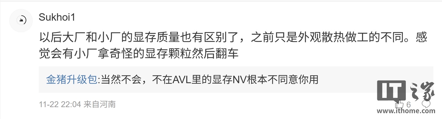 后续有用户在评论区表示:“以后大厂和小厂的显存质量也有区别了,之前只是外观散热做工的不同。感觉会有小厂拿奇怪的显存颗粒然后翻车”,博主回复道:“当然不会,不在 AVL 里的显存 NV 根本不同意你用”。