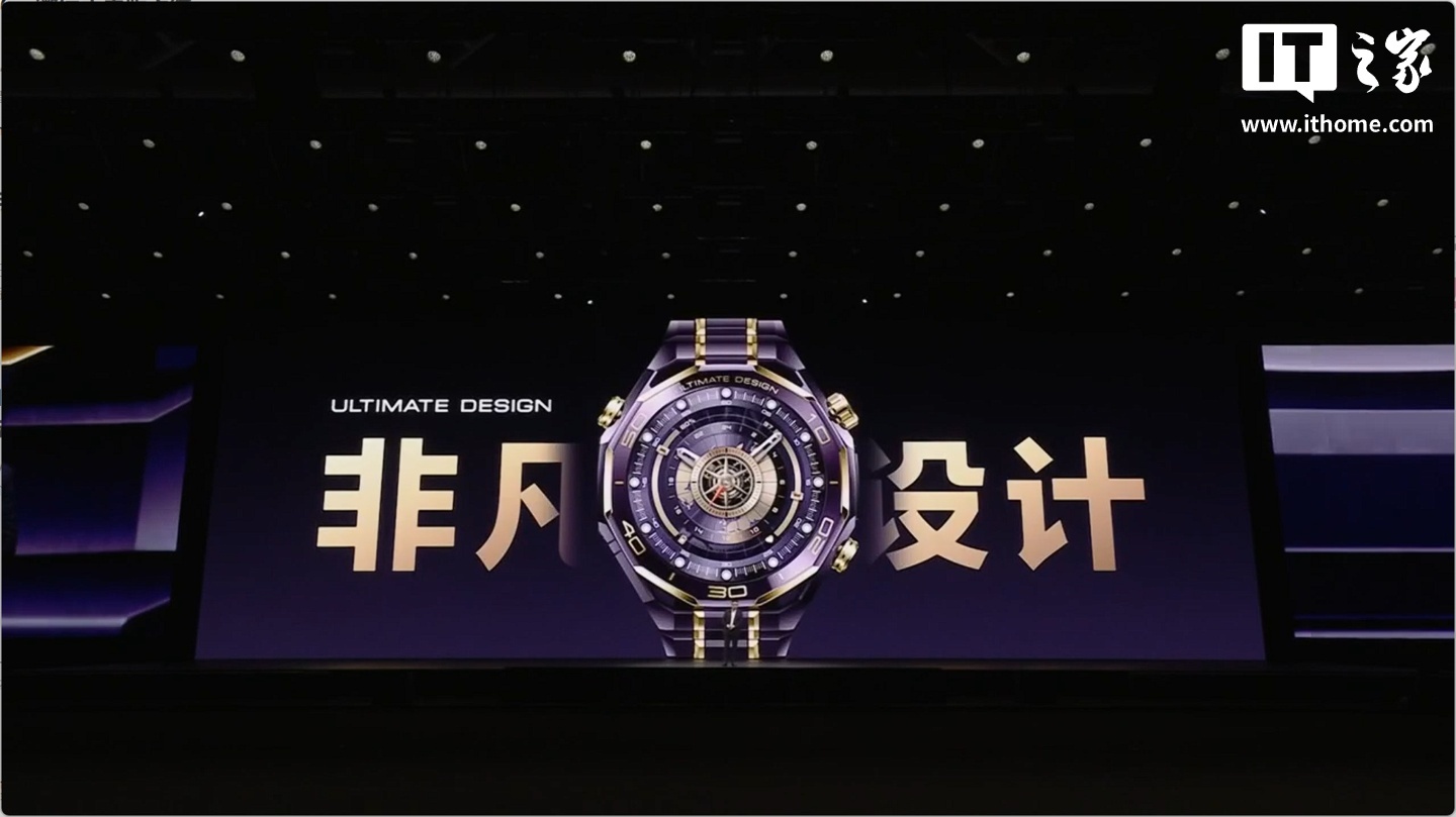 11 月 28 日消息,华为 WATCH ULTIMATE DESIGN 非凡大师手表新增“紫金”配色将于今日 9:08 开售,主打非凡设计,拥有十段 18K 金条、24K 镀金表带等旗舰设计,售价 24999 元。