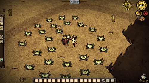 2.食人花可以用一块肉或生成的叶肉来诱饵周围的生物。玩家可以采集诱饵。当诱饵被采集或被其他生物吃掉时,所有眼球草都会死亡,食人花恢复到初始状态。冬季期间不会产生眼球草或诱饵。