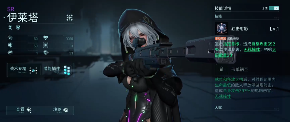 目前游戏当中的伊莱塔,她在使用效果上面其实门槛并不算高,人物设计效果也是为她带来了一批颜值粉,很多玩家觉得伊莱塔她只要后期在体验效果上面不出现数值崩溃的情况,她进行打磨一下的话,是一个非常好用的角色,目前达到SR品质的话,前期使用效果是不会出很大差错的。这里来她大家可以主要使用的技能效果叫做突击射影,这个技能效果是在依赖她进行狙击的时候可以触发的一个效果。