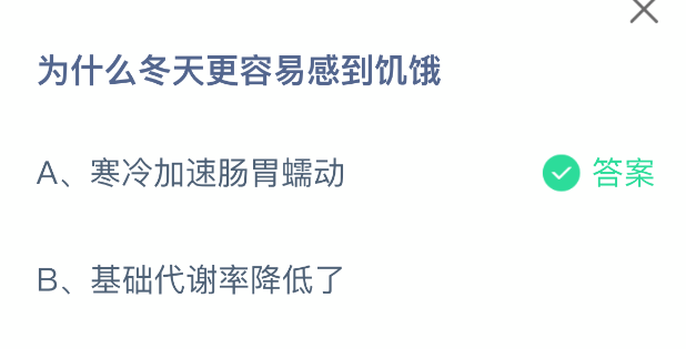 以上就是为什么冬天更容易感到饥饿,支付宝蚂蚁庄园2025年11月28日答案最新,更多精彩内容,请点击关注本站手游网更新!