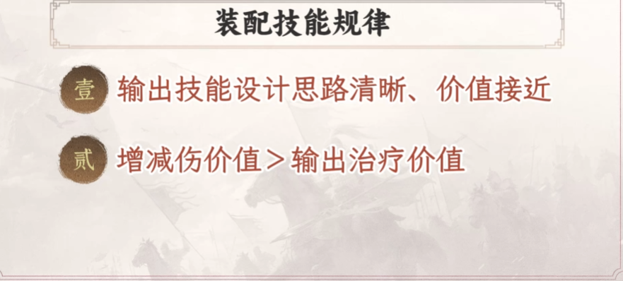 游戏当中增减伤类的装配技能相比输出和治疗作用更大,由于九牧之野整体提供的数值相对平衡,所以这里人数对战局的影响会更大,激活的效率很高,对于任何一方来说,治疗技能还没发挥效果,队伍就已经融化了,这个时候生效更容易的增减伤,就能帮大家打出更好的战损,比如大家在发育落后叠加被克制的情况下,在单挑中依靠全输出配队,趁对方主将还没发挥作用之前打出伤害就跑,很多的阵容在前期都不能连战,多待一秒就会爆炸,任何技能体系都有对应的控制效果来针对,所以在配队机制当中大家不仅是考虑的兵种或体系。