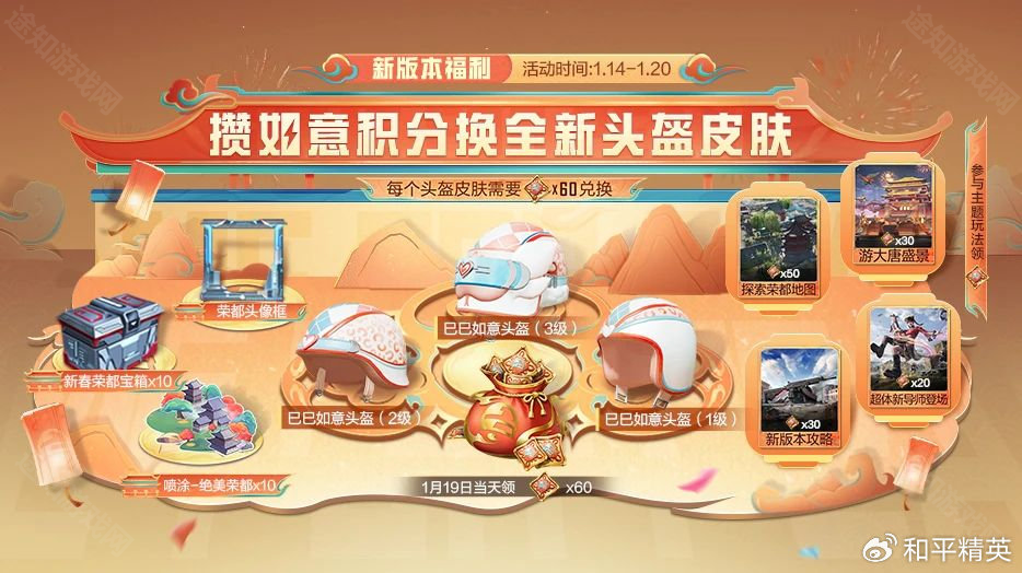 完成每日任务(每天最多领20如意积分)以及参与探索荣都地图、游大唐盛景、新版本攻略、超体新导师登场等4个活动获得130如意积分,可兑换全套头盔皮肤、荣都头像框、新春荣都宝箱、绝美荣都喷涂等福利。