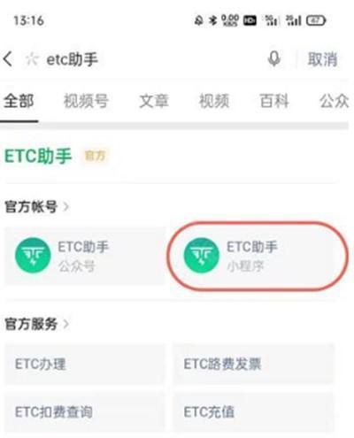 2、在搜索栏中输入并查找【ETC助手】,点击小程序。
