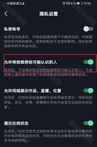 4、最后找到【允许将我推荐给可能认识的人】,点击让后面的绿色按钮变成灰色即可。