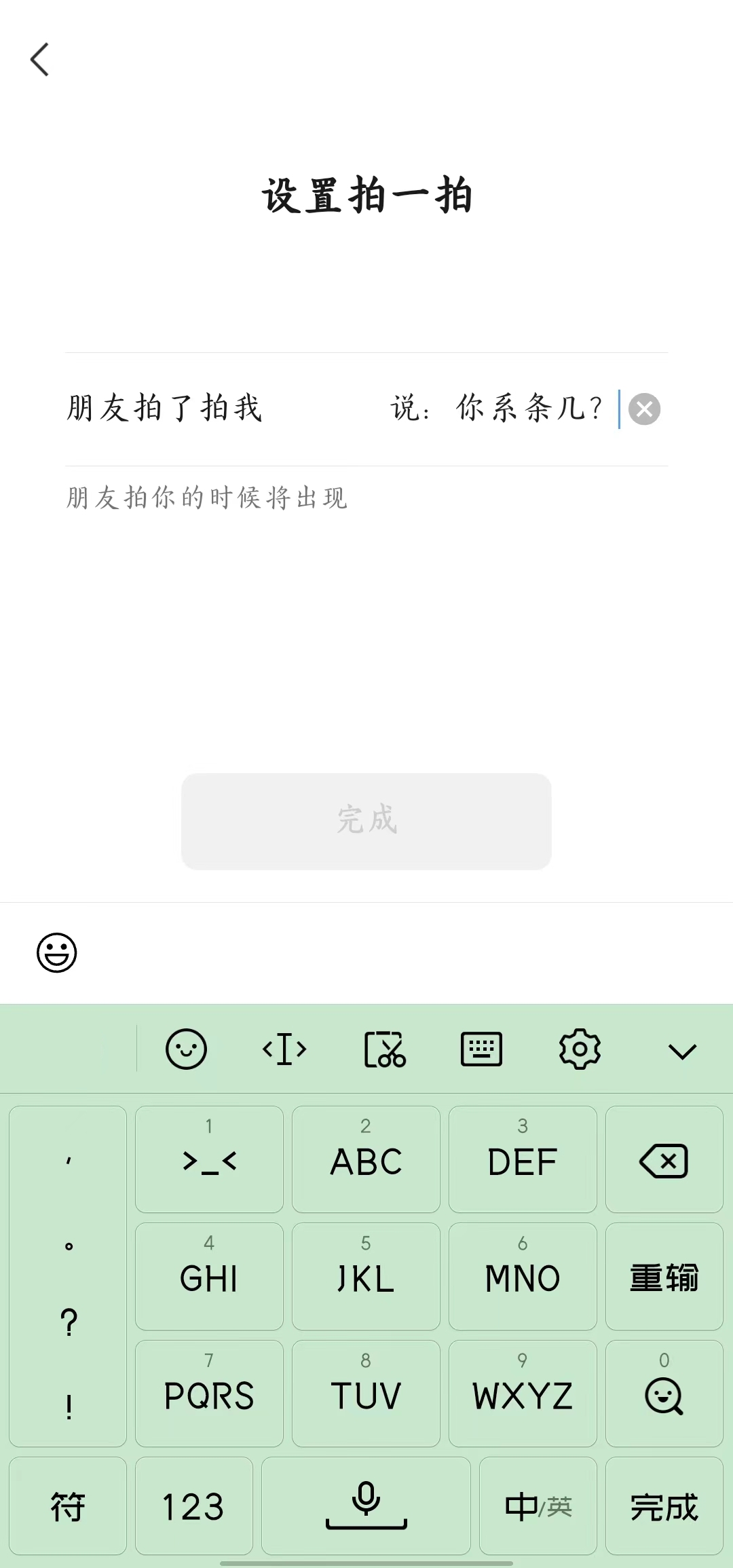 4、在朋友拍了拍我后面设置文字【小狗文字】,点击完成。