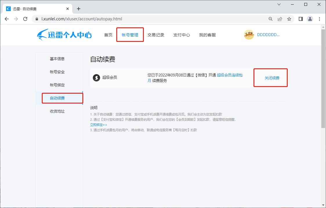 1、打开 迅雷个人中心---“账号管理”---“自动续费”