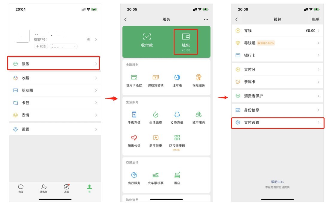 1、打开微信,登录自己的微信账号,点击微信右下角“我”---“服务”---“钱袋”---“支付设置”