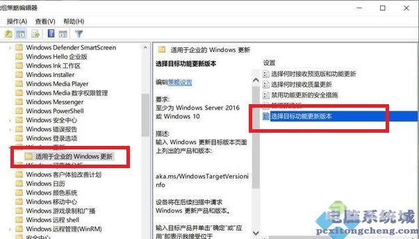 3、随后依次打开计算机配置-管理模板-Windows组件-Windows更新,再打开其中的选择目标功能更新版本