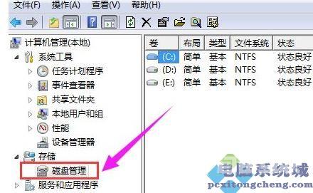 2、在计算机管理中的存储选项下找到磁盘管理。