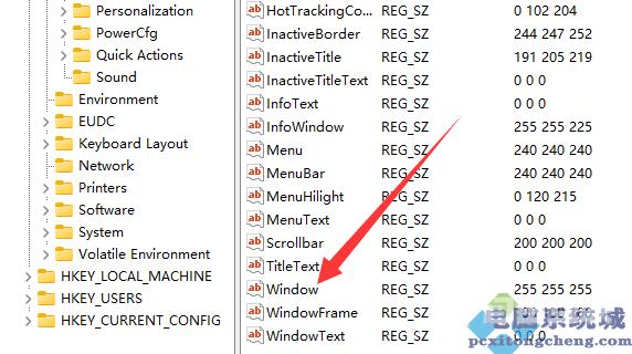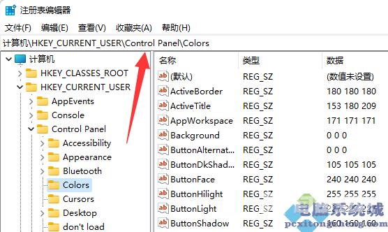3、然后进入计算机HKEY_CURRENT_USERControl PanelColors位置。