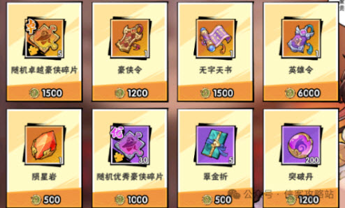 7、帮会商店:优先兑换英雄令、豪侠令、秘籍、突破丹、陨星岩。后期停止兑换豪侠令,转而兑换秘籍并存储帮贡,以备后续技能升级所需。