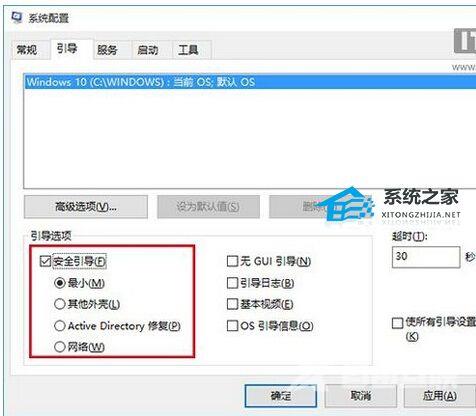 2. 在“引导”标签页勾选“安全引导”,默认的“最小”即加载项最少,如果你有其他要求可酌情选择其他项目,比如你需要网络连接,就可以选择“网络”,然后点击“确定”。