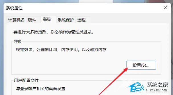 4、然后在高级选项卡下,找到性能“设置”点击进入。