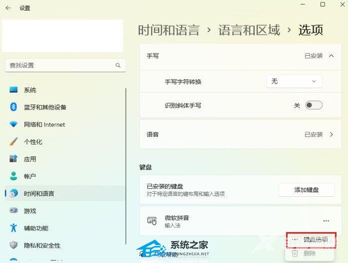 2、选择时间和语言,点击中文后面的三个点击,选择语言选项。