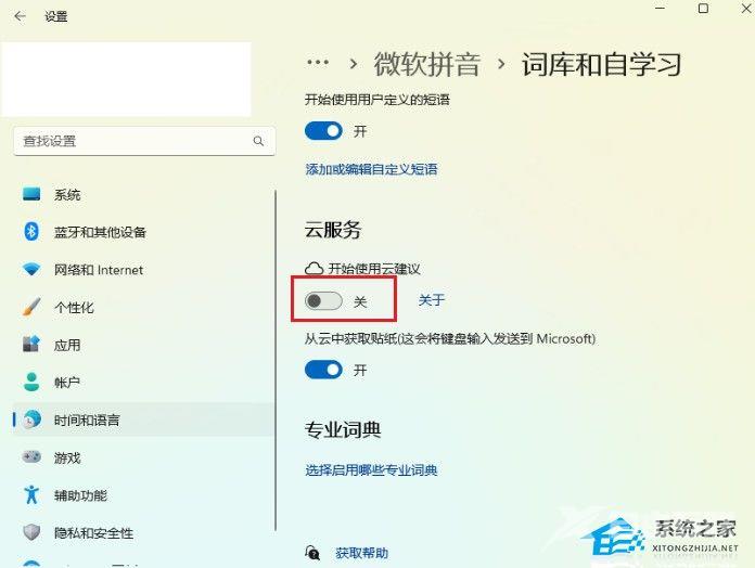5、云服务页面,点击关闭开始使用云建议。