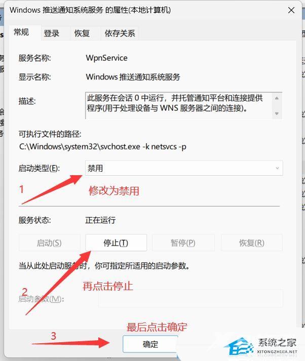4、Windows 推送通知系统服务 的属性(本地计算机)窗口,启动类型修改为,再点击,最后点击。