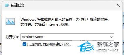 9、新建任务窗口,输入命令,按,即可重新启动Windows 资源管理器(建议勾选以系统管理权限创建此任务)。