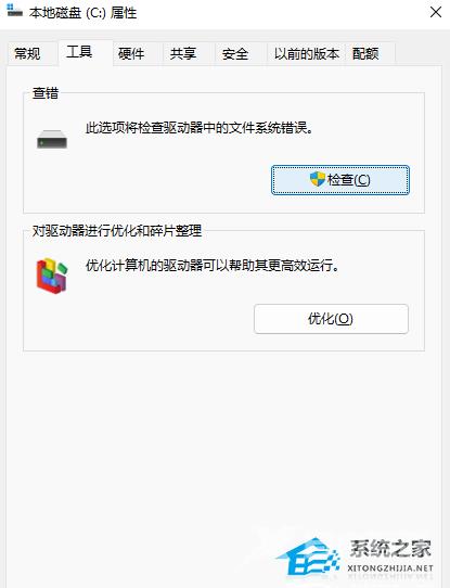 3、本地磁盘(C:)属性窗口,切换到工具选项卡,然后点击查错(此选项将检查驱动器中的文件系统错误)下的检查。