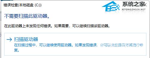 4、错误检查(本地磁盘 (C:))窗口,不需要扫描此驱动器。在此驱动器上未发现任何错误。如果需要,可以继续扫描该驱动器。点击扫描驱动器(在扫描过程中,可以继续使用驱动器。如果发现错误,你可以决定是否对其进行修复)。