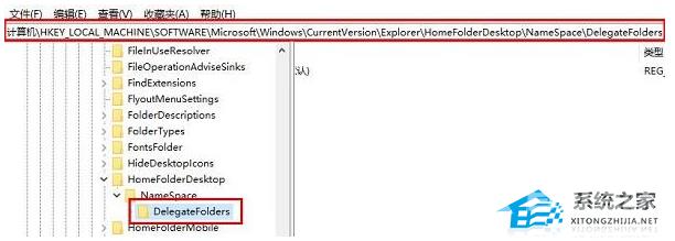 2、然后依次展开:HKEY_LOCAL_MACHINESOFTWAREMicrosoftWindowsCurrentVersionExplorerHomeFolderNameSpaceDelegateFolders。