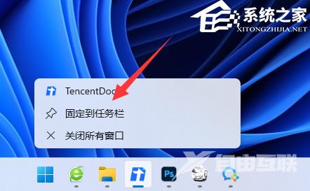 2、打开之后,会在任务栏中出现这个软件图标,右键点击它,选择“固定到任务栏”。