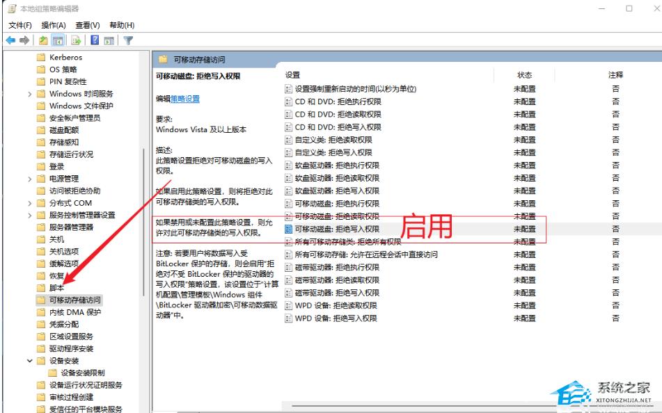 3.选择系统个文件夹下方的可移动存储访问-将拒绝写入权限弃用就设置完成了。