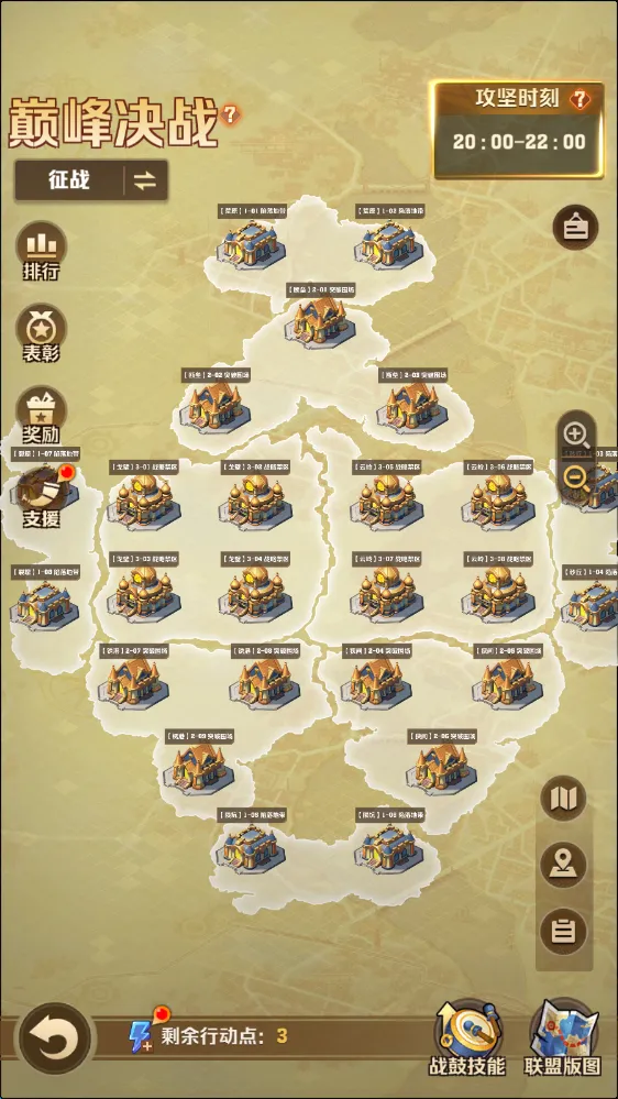 巅峰对决总计由25座城池及9大版块,单独占领整座板块的所有城池,可额外获得1.4倍积分。