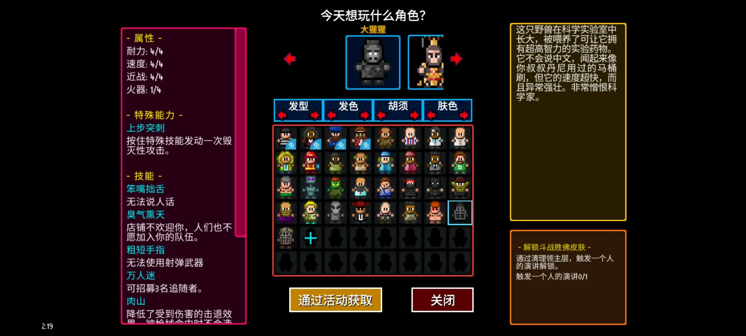 大猩猩有 “臭气熏天” 的负面技能,会导致店主和酒保恼怒,影响交易,可通过开启 “解除限制” 的突变后,花金币从升级亭消除该技能。