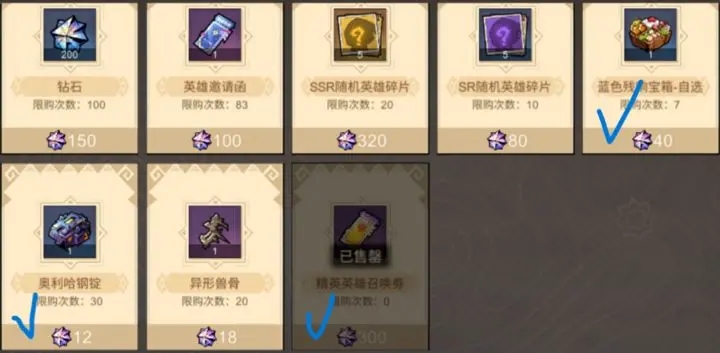 图里打勾的必买,红伞伞必须扫光,相当于80钻100体,比直接买体力——200钻200体力便宜。矿石也是价格便宜直接扫了。