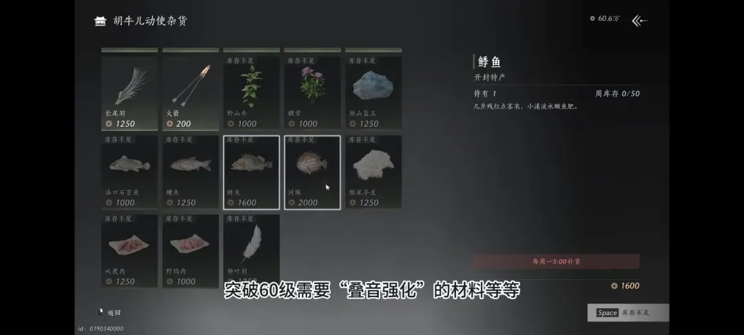 开封和清河的杂物商每周限定数量的材料记得购买完毕,包含烹饪的材料,突破60级需要叠音强化的材料等等,体力溢出的兄弟们赶紧做烹饪,卖到百业,距离白嫖天赏就能更进一步。