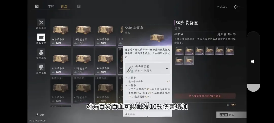 然后来说岳山倾套装,对方血越多,打的越疼,越少越递减对方百分百血可以触发10%伤害增加,血低于50%就没有伤害增加,适用于所有流派的群体PVP的首波免伤输出。