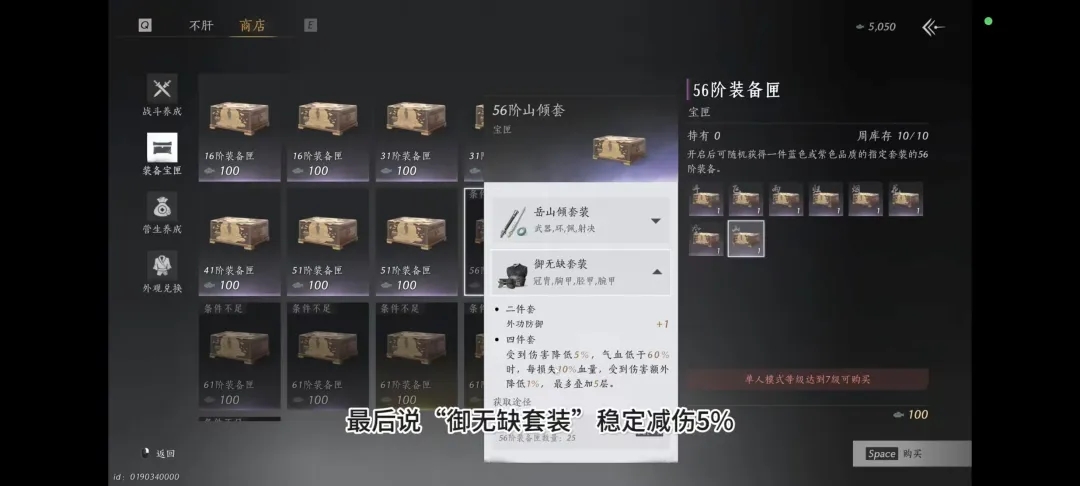 最后说御无缺套装,稳定减伤5%,血越少减伤越多,最多5层,可以减10%,减伤效果1增生血量减少而增加,也可以适用于全部流派选择。