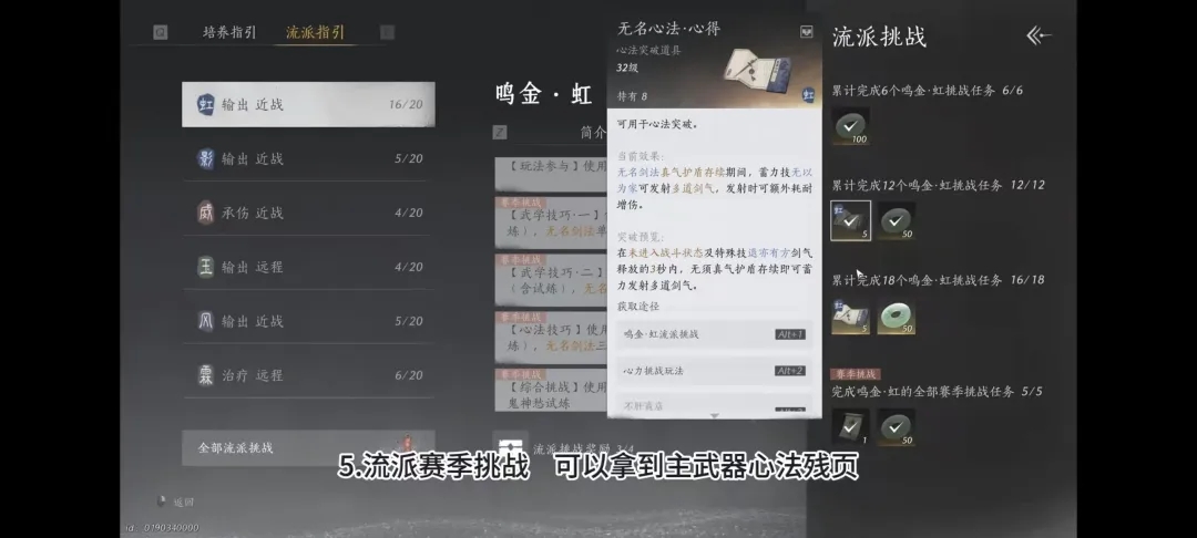 流派赛季挑战可以拿到主武器心法,残页可以尽快给主武器心法升层。
