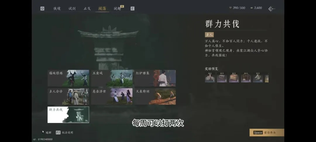 同游闯荡-群力共伐的世界boss每周可以打两次,建议一次性打完,可以概率获取时装以及抽奖次数。