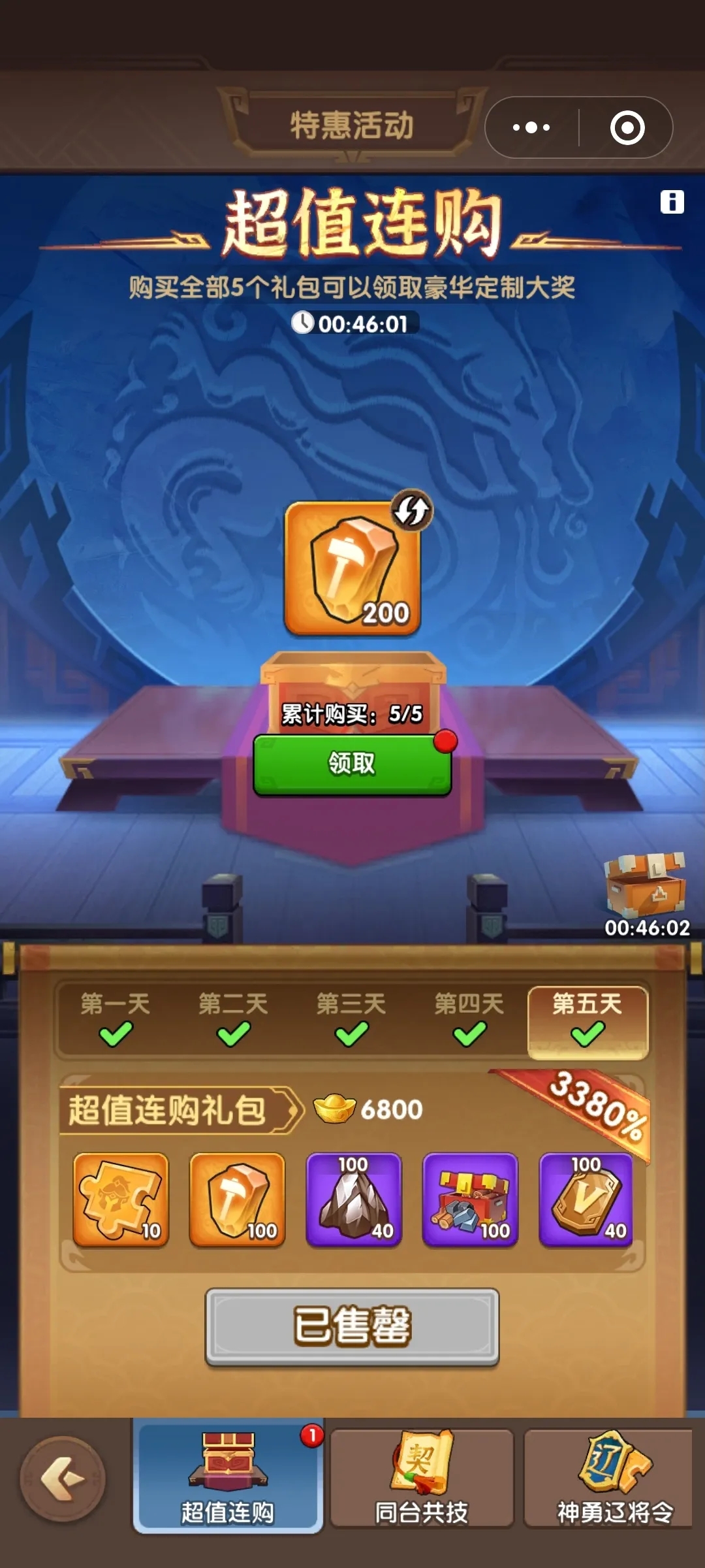风采氪金拿神兵道具是真的划算,比平常哪些高达“1400”的神兵礼包,至少有2倍以上的道具。换成神兵道具的话看神兵篇:神兵秘宝/玉石升阶所需材料曝光!跟着里面的升级思路平均换取神兵道具。大佬要是想拉满的话,差不多购买满五天礼包就可以了。