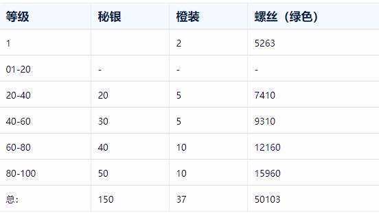 道具专为英雄神话装备的升级与赋能所用,装备强化等级达到100级,专精锻造10级,可以淬炼传说橙色装备变成红色神话装备(也就是常说的红装)。变成红装以后才用的到秘银,每20级可以赋能,消耗秘银和橙装,消耗情况如下: