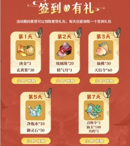首先是签到有礼!在签到第1天、2天、3天、5天、7天可以分别获得资源一份,合起来资源总计有:庚金3个、玄黄果30、琉璃珠20、精气丹1个、仙桃30个、天衍令60、瓶子10个、御灵石50、召唤令3个、仙玉100、丹药5个!还别说,资源种类还挺多!