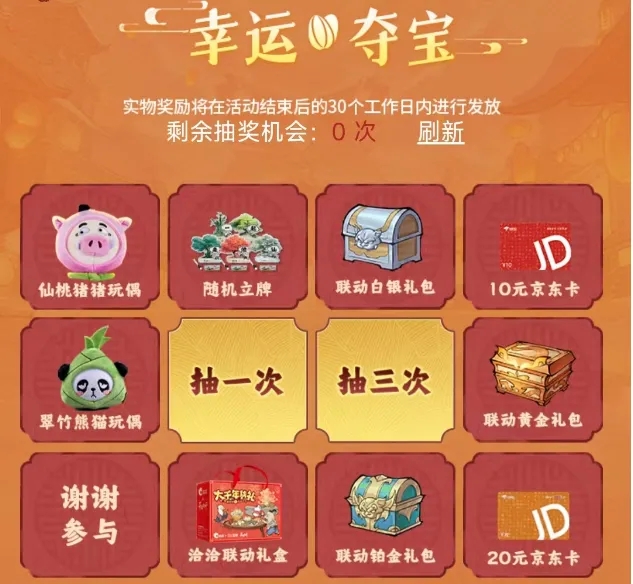实物奖励:仙桃猪猪玩偶、随机立牌、10元京东卡、20元京东卡、洽洽联动礼盒、翠竹熊猫玩偶