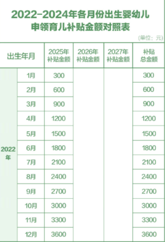 标准为全年3600元(每月300元),2025年后出生者连续3年可获10800元。