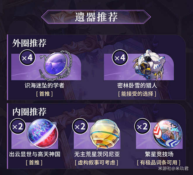 内圈首推出云,三模式泛用,虚构叙事可以考虑无主荒星,如果有镜流身上卸下来的极品冰球充能绳繁星也可以用。