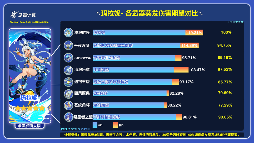 在黑曜套的加持下,靠着自身过硬的素质,玛拉妮不用担心双暴的问题,在这种前提下,祭星者之望可以帮助玛拉妮打出不俗的蒸发表现,精炼1阶的伤害期望也在90%左右。