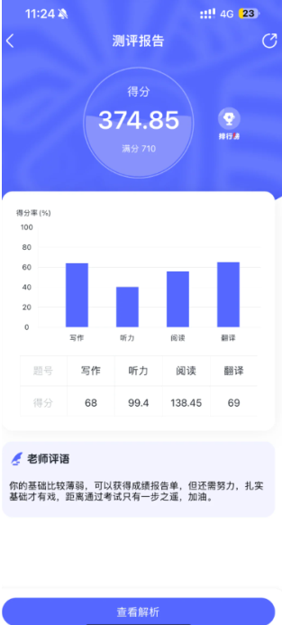 估分完成后,APP会显示预测总分及各部分(听力、阅读、写作、翻译)得分情况。