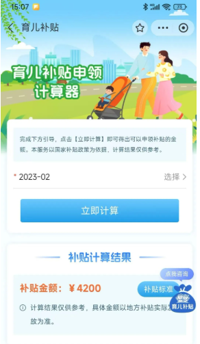 3.点击【育儿补贴计算器】选择幼儿出生时间并计算