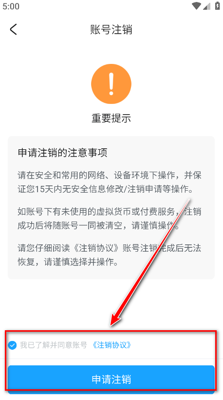 5.勾选我已了解并同意账号《注销协议》,再点击申请注销。