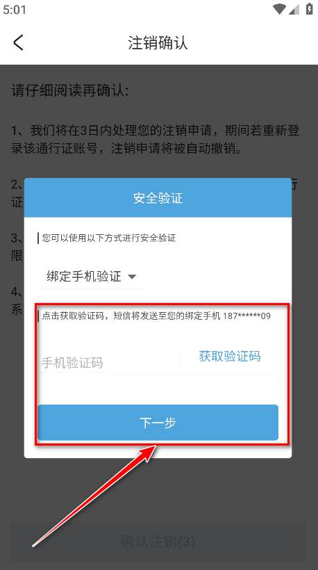 7.输入手机验证码,点击下一步。