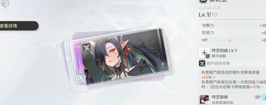 第二个是索利亚的时空扭曲,这个专武还是相当有意思的,属于游侠专武,该角色主要负责战斗员造成额外伤害增加20%,比较契合当前版本的主C角色,常常适合和雨果搭配使用,在整体的战斗方面还是较为突出的,并且在一回合内攻击卡牌伤害量再加10%,还是能够打出不错的回合成绩。