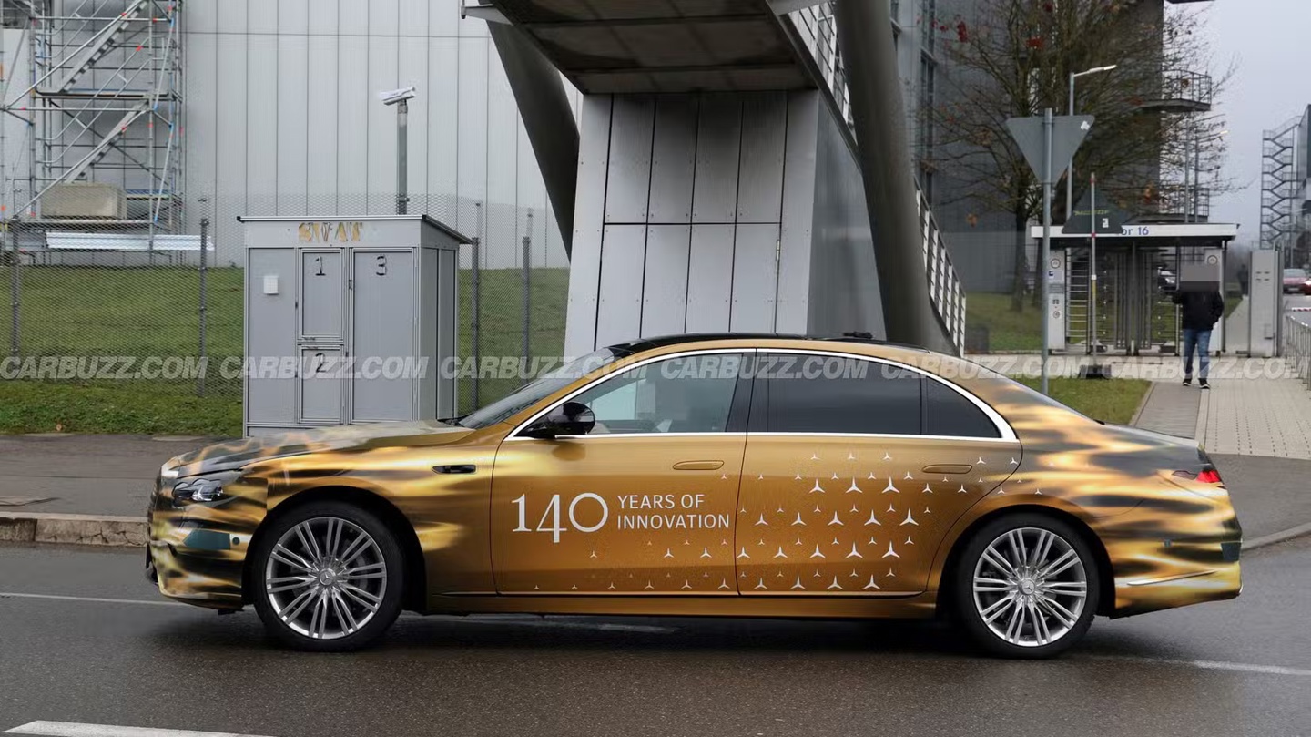 11 月 29 日消息,汽车媒体 CarBuzz 昨日(11 月 28 日)发布博文,分享了一组抓拍的路测图,展示了梅赛德斯-奔驰为 140 周年筹备的 S 级轿车原型车,车身上覆盖有金色的火焰伪装膜。