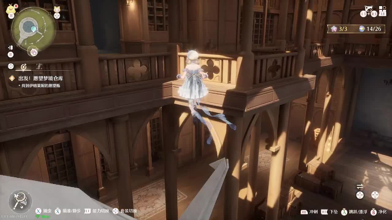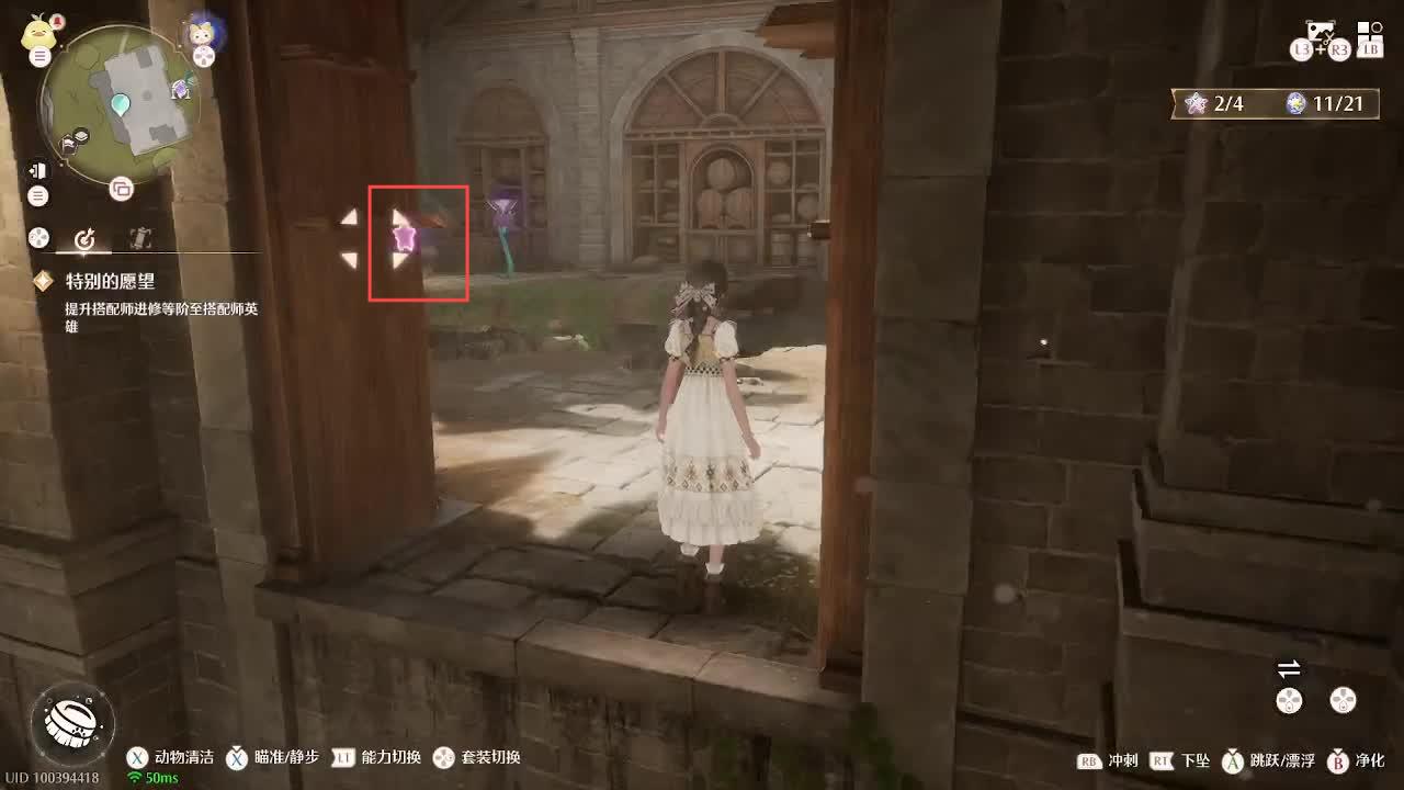 剧情演出完毕之后来到一处被柜子堵住的门前,需要收集奇想星,向后转在右边有一处被藤蔓遮掩住的门,拨开藤蔓获得奇想星,制作出漂浮能力套装跳过柜子抵达外面。