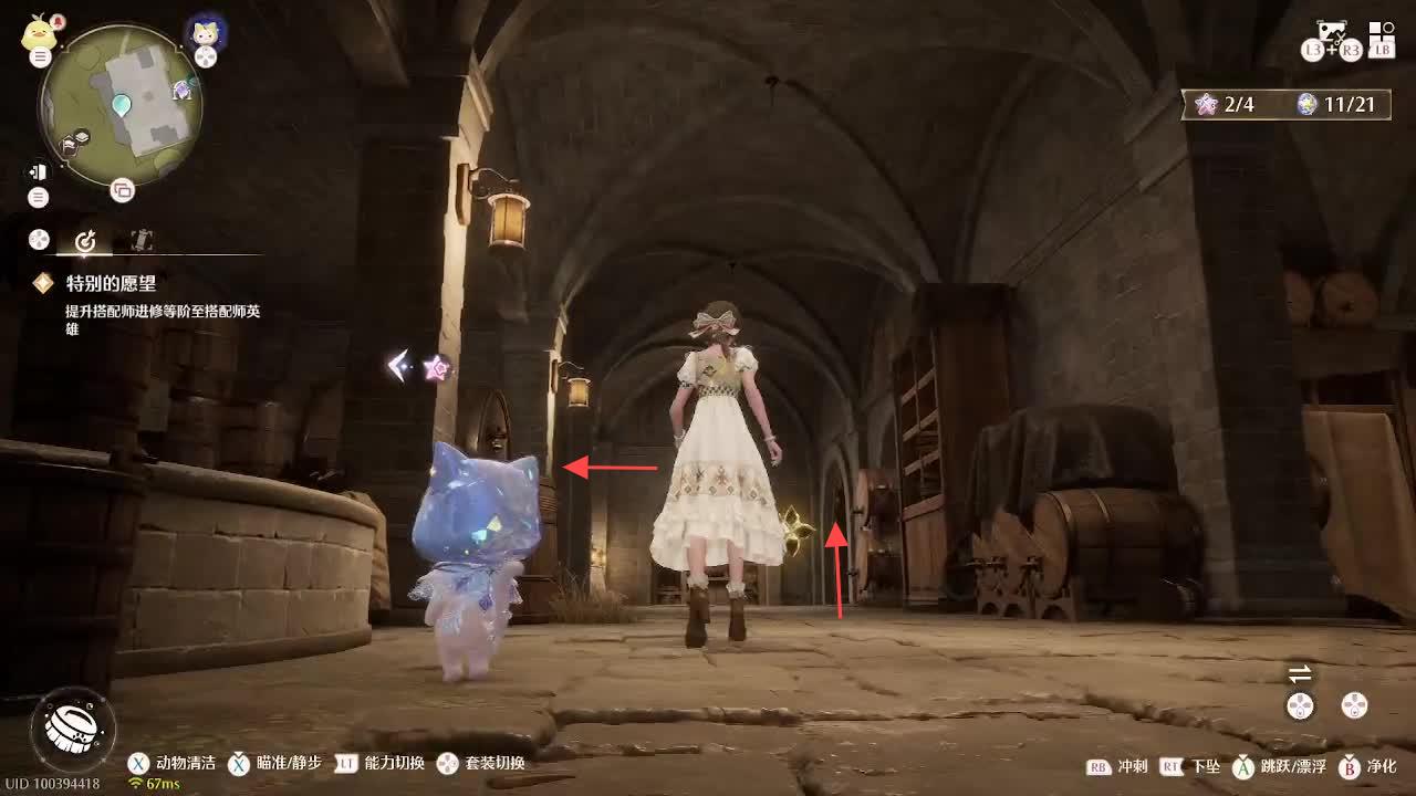 接下来进入副本的第二部分,往前跳跃到平台上,走一段时间之后进入大喵视角可以看见在屏幕的最右边有一颗奇想星,沿着黄色箭头跳跃就可以获得第二颗奇想星